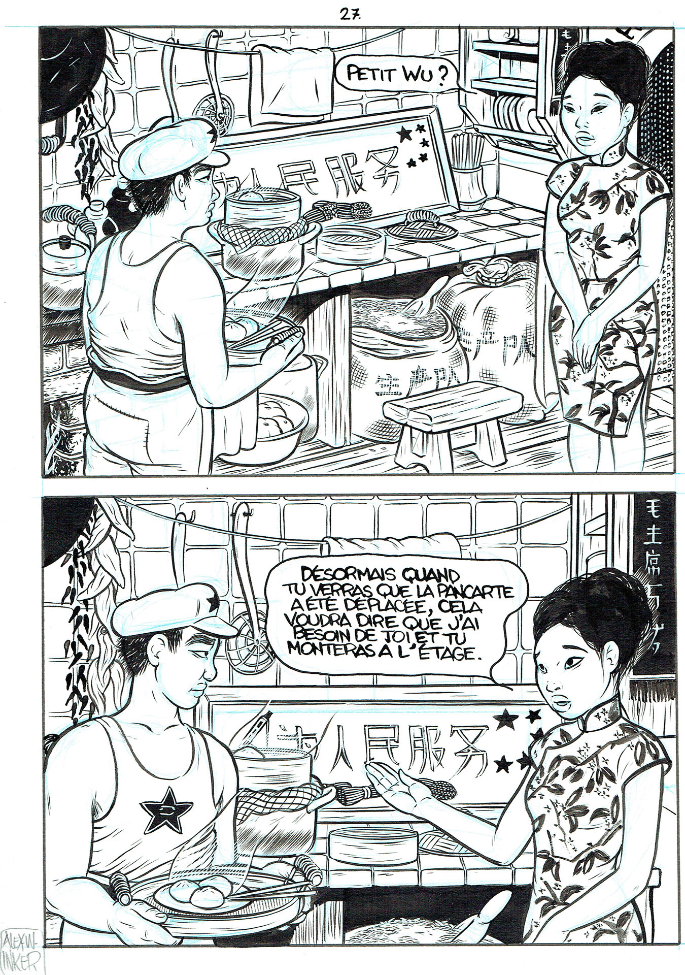 Original comic art by french comic artist Alex W. Inker. Page 27 of "Serve the people", the comic book adaptation of Yan Lianke's novel. A love story happening during the chinese cultural revolution. Blue pencil and ink on paper.