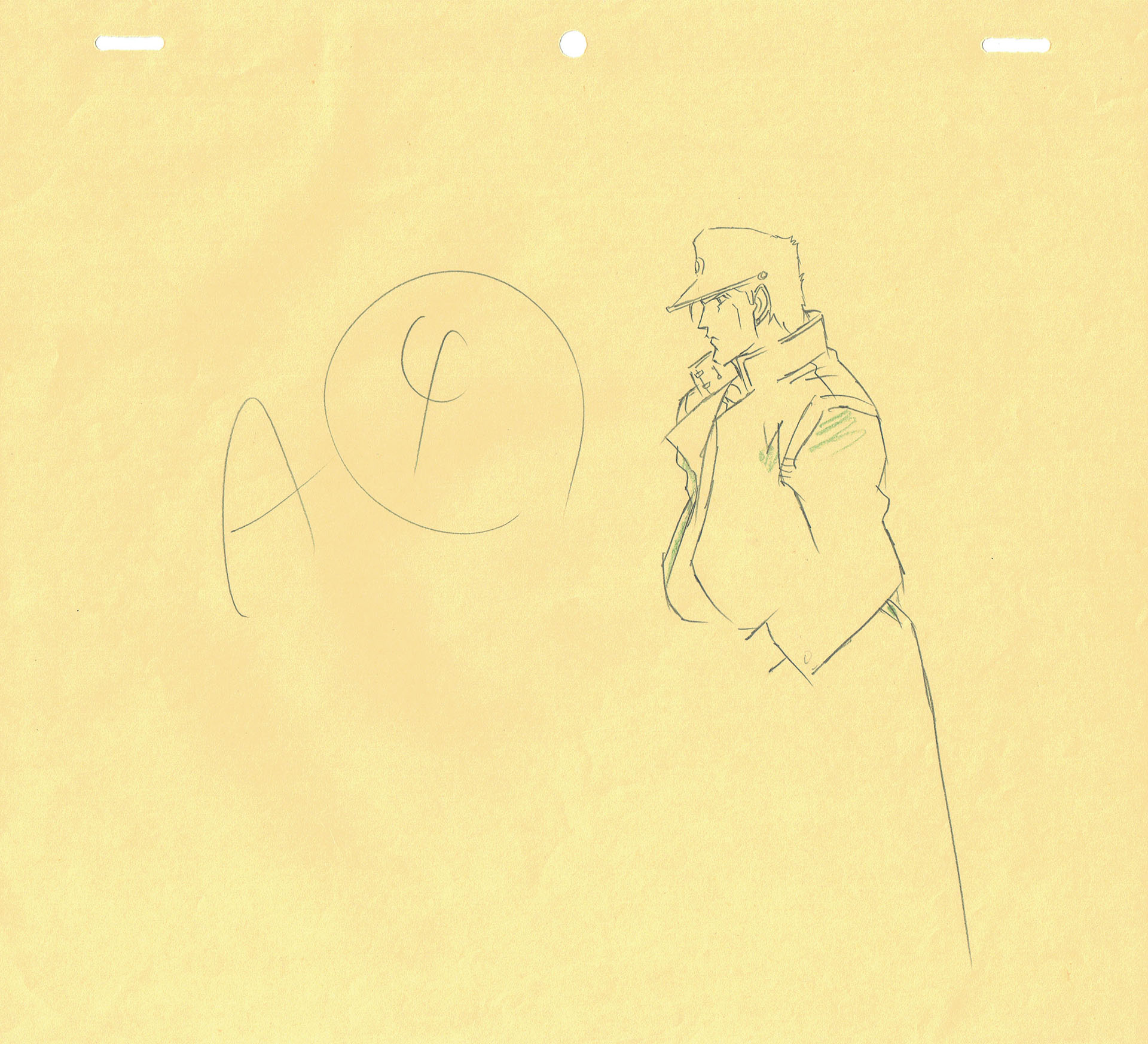A genga correction sheet is an original Japanese animation production drawing, drawn by the animation director, and made in graphite pencil and colored pencils on yellow animation paper.