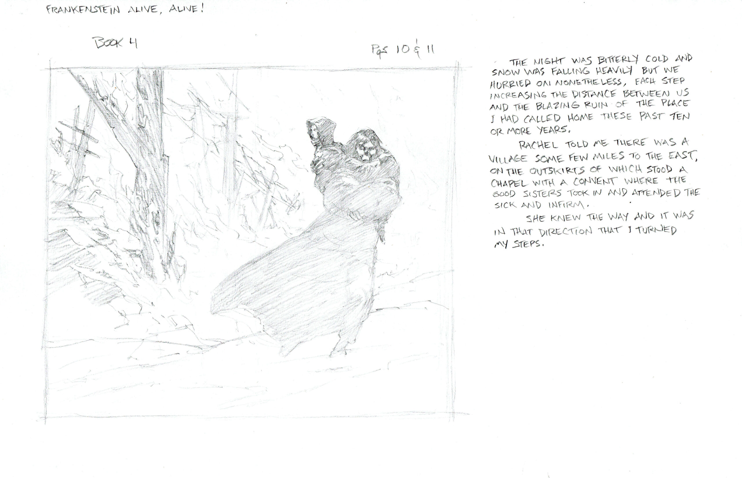 Original preliminary drawing for pages 10 and 11 of issue 4 from the 4-issue Frankenstein Alive, Alive! comic book series, published in 2018 by IDW.