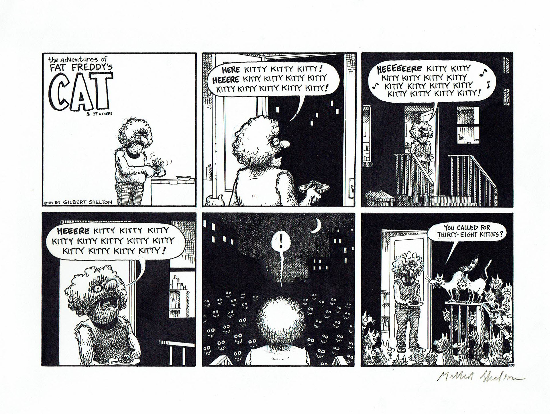 Original comic art by Gilbert Shelton. Fat Freddy’s Cat : “38 kitties”.