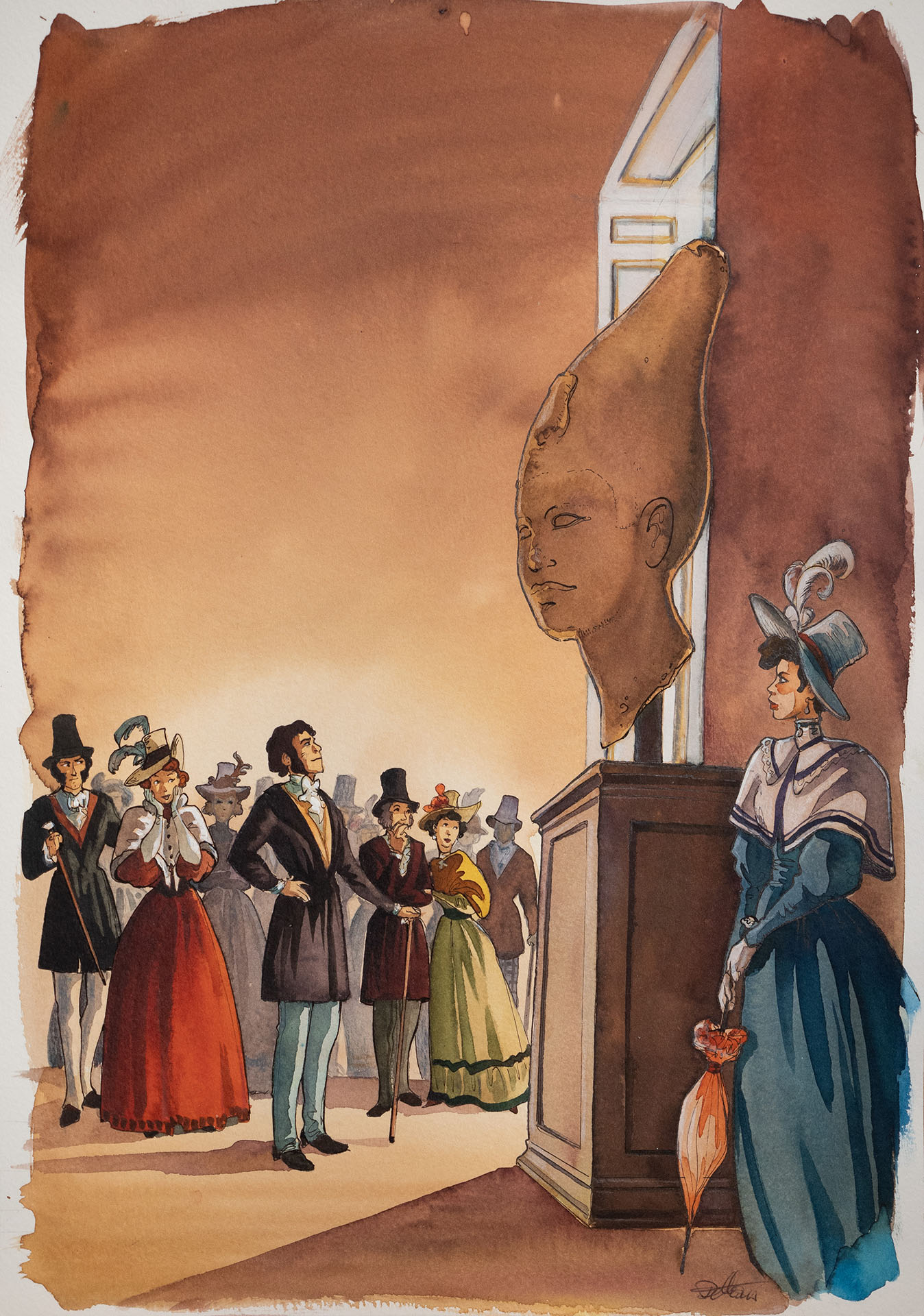 Original comic art and illustration art by French comic book artist Isabelle Dethan. Ancient Egypt : A day with Champollion, illustration #4 : Champollion as the first curator of the Egyptian section of the Louvre Museum. Used in an event which took place in Paris, in the world famous Louvre museum on June 18, 2016. The original comic art of Isabelle Dethan is exclusively for sale at Galerie de la Bande Dessinee.