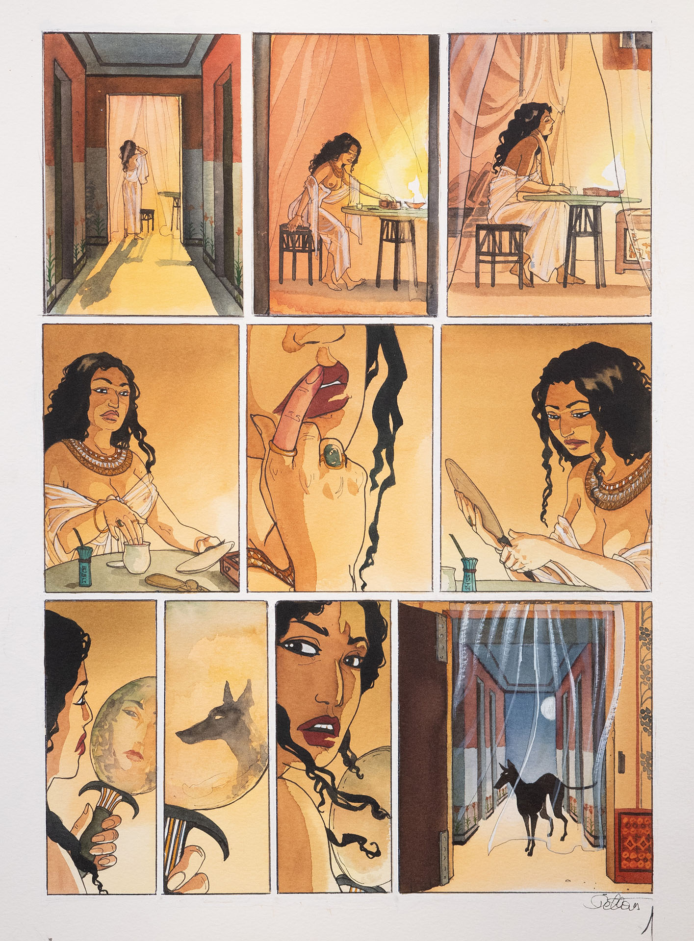 Original comic art and illustration art by French comic book artist Isabelle Dethan. Ancient Egypt. Sur les terres d'Horus, Book 3 page 1. The original comic art of Isabelle Dethan is exclusively for sale at Galerie de la Bande Dessinee.