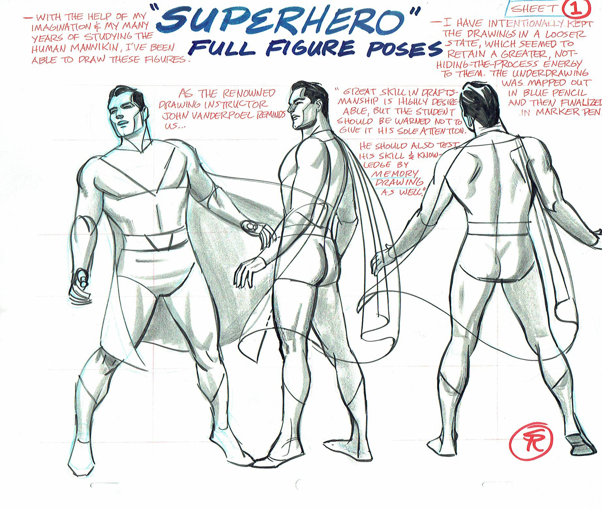 Original comic art by Steve Rude. Four pages of illustrations depicting Superheroes.