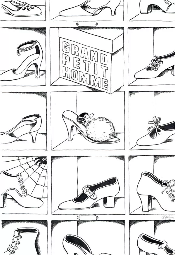 Vente de planches de BD et dessins originaux de Zanzim. Publié dans le roman graphique « Grand Petit Homme », paru aux éditions Glénat en 2024. Grand Petit homme, couverture originale. Les originaux BD de Zanzim sont réalisés à l’encre sur papier. « Grand Petit Homme » est une bouleversante histoire d’amour non conventionnelle, qui confronte désir et bonté, avec humour et bienveillance. Les planches originales de bande dessinée de Zanzim sont en vente exclusivement à la Galerie de la Bande Dessinée.