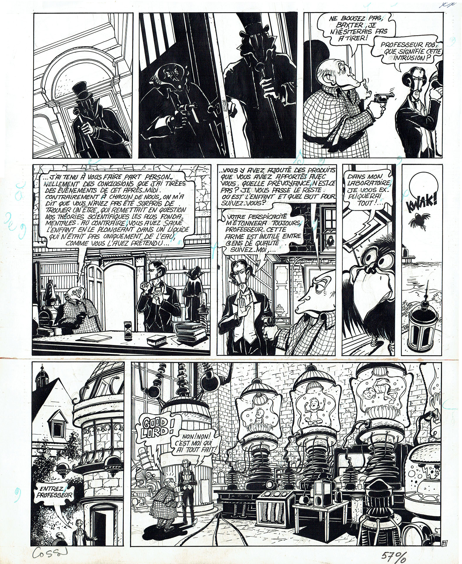Planches de BD et dessins originaux d'Antonio Cossu. Alceister Crowley : La longue marche du Nombrilus, page 12. Publié dans le magazine Spirou. Cette planche originale de bande dessinée est réalisée au crayon, à l'encre, avec de la trame autocollante, et des collages. Les originaux BD sont des œuvres d’art uniques, qui disposent de la bande dessinée publiée comme référent.
