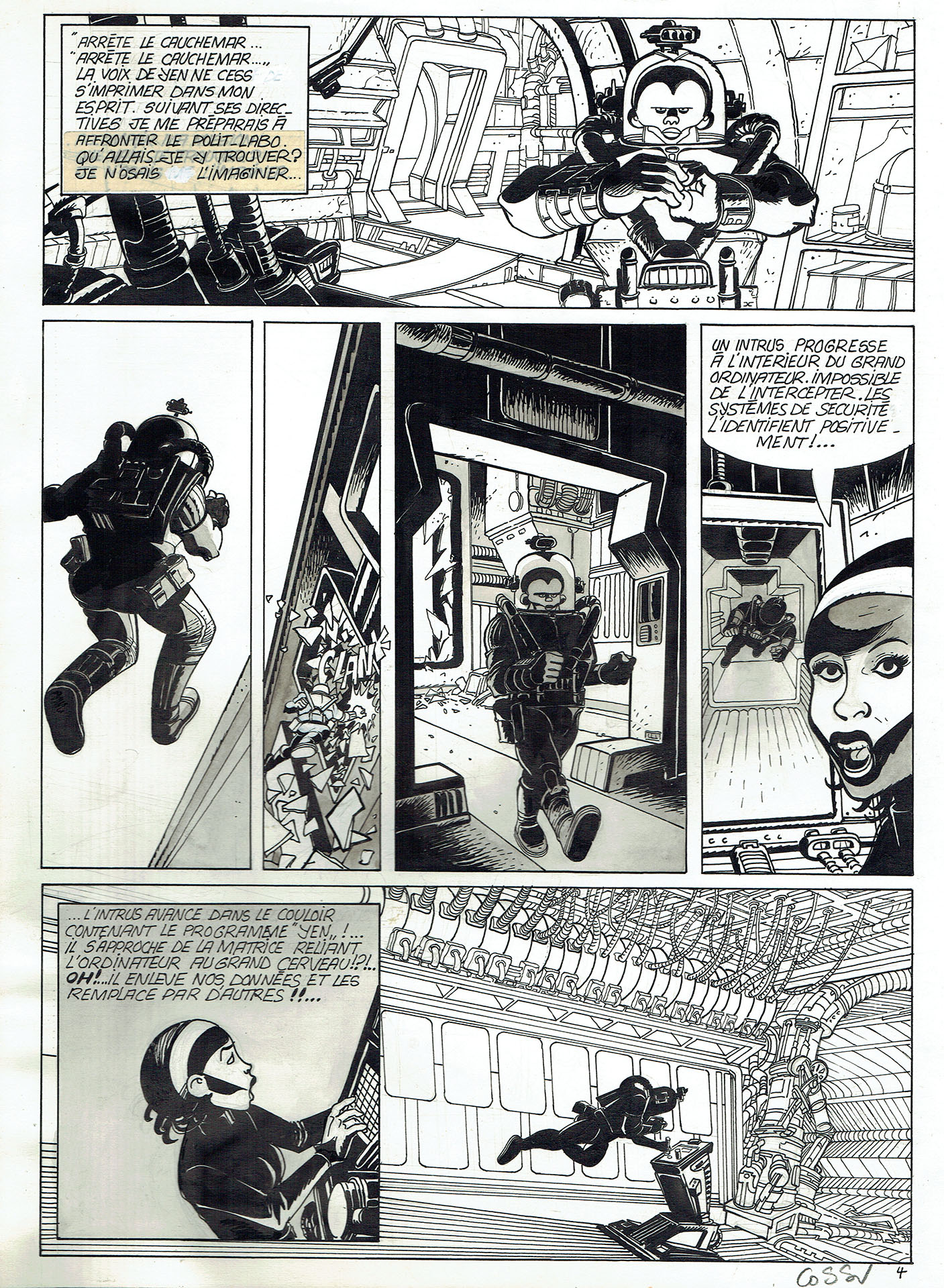 Planches de BD et dessins originaux d’Antonio Cossu. Yen, page 4. Publié dans Spatial n°8. Cette planche originale de bande dessinée est réalisée au crayon, à l’encre, avec de la trame autocollante, et des collages. Les originaux BD sont des œuvres d’art uniques, qui disposent de la bande dessinée publiée comme référent.