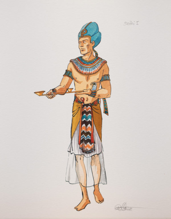 Planches de BD et dessins originaux d’ Isabelle Dethan. Sethi I, illustration originale publiée en août 2016 dans « Le Figaro Histoire ». Les planches originales de bande dessinée d’ Isabelle Dethan sont en vente exclusivement à la Galerie de la Bande Dessinée. Les originaux BD d’ Isabelle Dethan sont réalisés au crayon, à l’encre et aux encres de couleur. La scénariste-dessinatrice Isabelle Dethan est l’une des plus grandes spécialistes de l’ Égypte antique dans la bande dessinée contemporaine. Sa maîttrise des encres de couleur nous offre de superbes dessins originaux de l’Égypte antique.