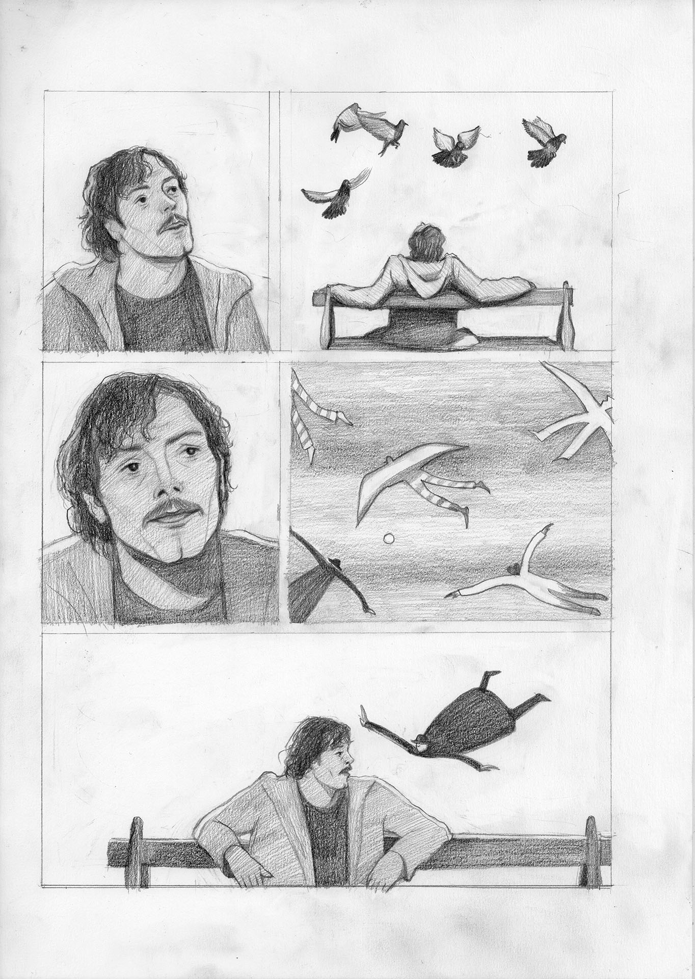 Planches de BD et dessins originaux de Maran Hrachyan. Page 101 de l'album "Patrick Dewaere", publié aux éditions Glénat en 2021. Premier album de l'autrice pour cette biographie du célèbre acteur de cinéma français. Cette planche originale de bande dessinée est réalisée au crayon et un fixatif a été appliqué sur l'oeuvre.