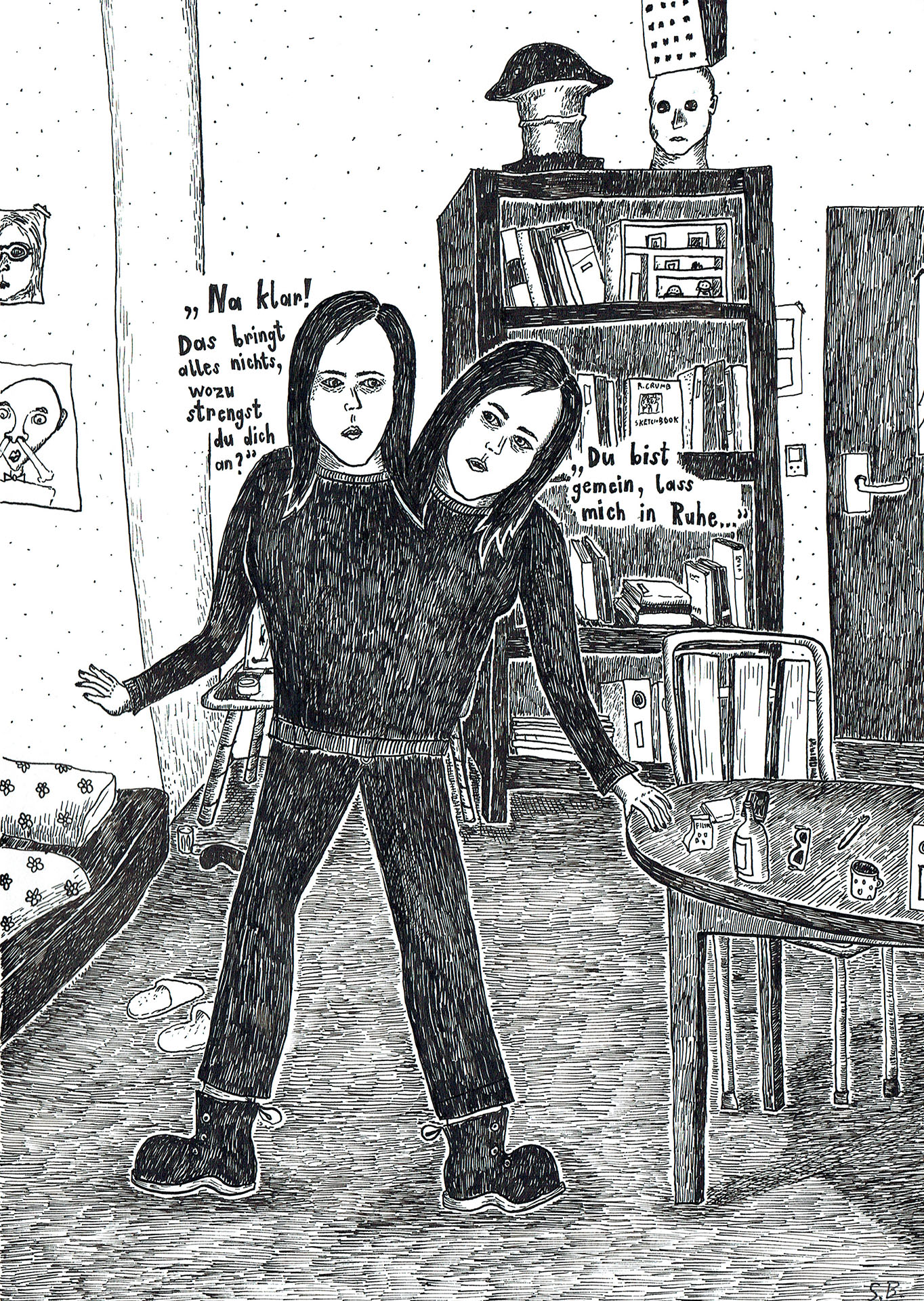 Planches de BD et dessins originaux de Simone Baumann. Simone et moi, page 154. Cette planche originale de bande dessinée de Simone Baumann est réalisée au crayon et à l’encre. Les originaux BD sont des œuvres d’art uniques, qui disposent de la bande dessinée publiée comme référent.