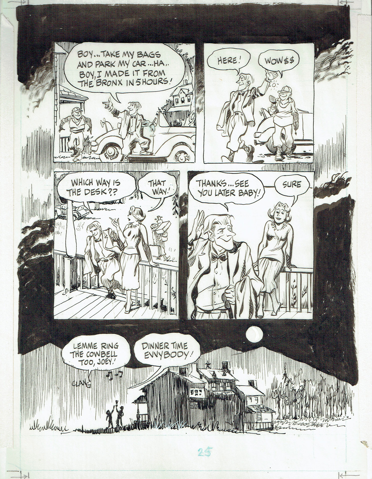 Planche de BD de Will Eisner. Un pacte avec Dieu, « Cookalein » encrage page 25. Réalisé à l’encre sur vellum, le vellum étant fixé sur un papier 150 gr par collage sur tout le pourtour. Les dimensions des originaux BD sont celles du support papier.